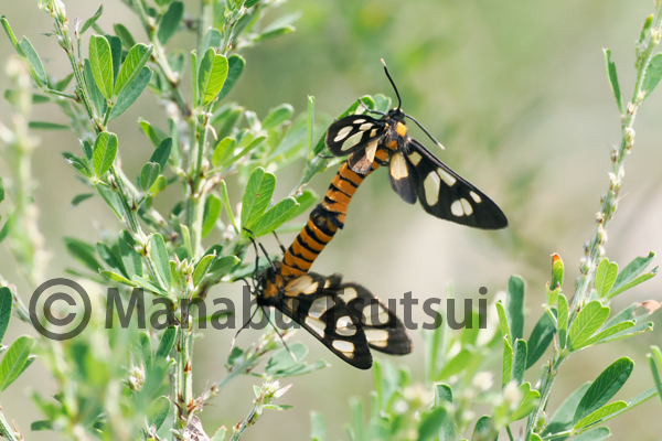 横田さんが、メドハギにカメラを向けていたのはキハダカノコの交尾でした。発生期は終わりに近いとのことですから、ラッキーな副産物でした。このキハダカノコも局所発生で、普通種のカノコガとは対照的な存在です。ウスバカマキリと生息環境の共通点があるようです。
