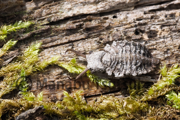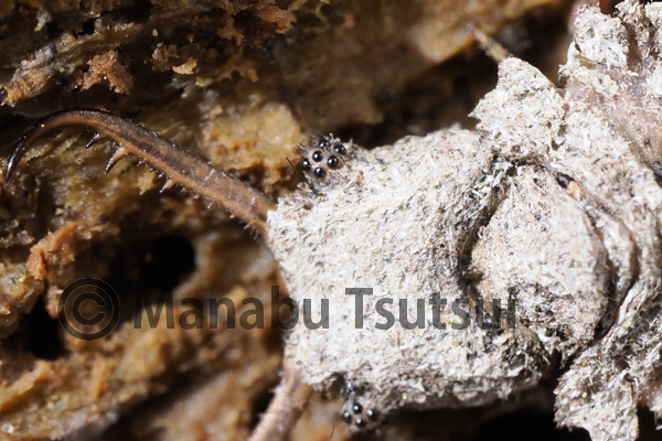 そんな時、横田さんが、産卵が始まっているかどうか、石や木片を裏返していた時でした。木片の裏側にツノトンボ類の幼虫が張り付いていたのを見つけました。環境的にキバネツノトンボかツノトンボのいずれかと思いますが、キバネツノトンボは見られず、ツノトンボは確認されていることから、ツノトンボの幼虫と思われます。体表が妙に白っぽいと思いながら拡大で見てみると、パルプのような一律の付着物が覆っていました。