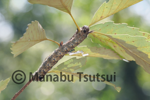 林縁を歩くと、コナラの枝先にタカサゴツマキシャチホコの幼虫が見つかりました。体長は5㎝ほどで、丸々として老熟間近という感じです。