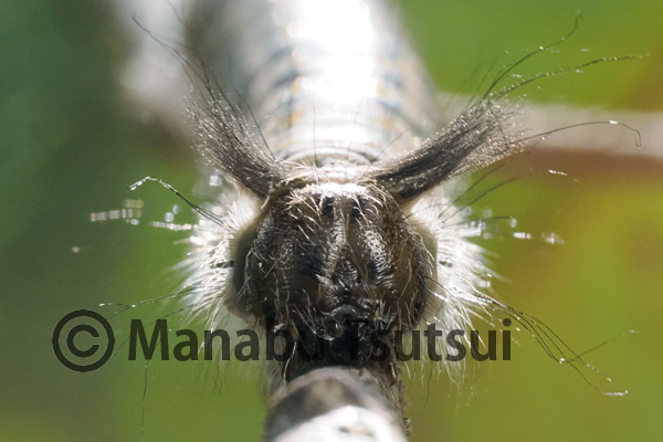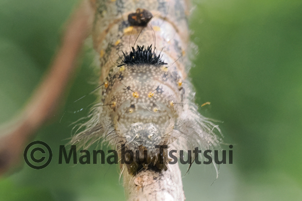 腹部の末端近く第8節に短い毛束が中央にあります。7節には毛ではない突起物があります。
