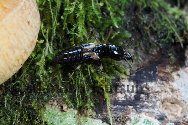 頭部が発達しているのは雄の特徴ですから、性的二型がある興味深いハネカクシです。キノコに掘ったトンネルから、顔をのぞかせていました。