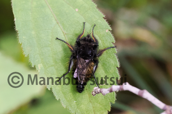 足元の葉に張り付く、なんとも個性的ないでたちのアブが目に留まります。調べてみると、ヒゲボソムシヒキ(ムシヒキアブ科)の一種のようです。
