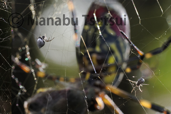カメムシを食べるメスの網をのぞき込むと、小さな別のクモが数個体見つかります。