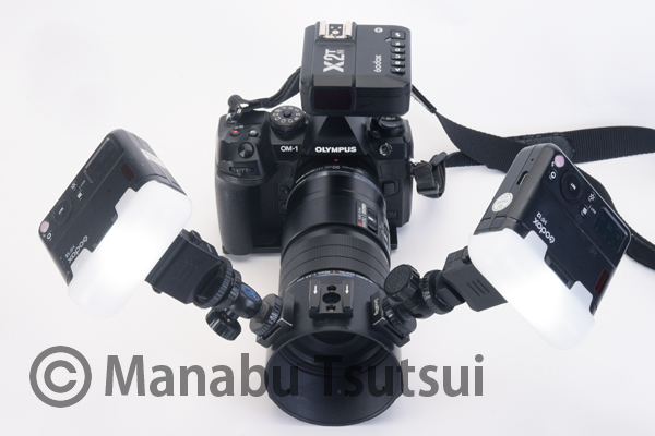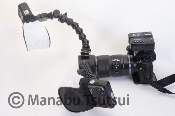 正面右側の取り付け部をUlanzi製ダブルボールヘッドにし、近接撮影でのフロント側の発光部として、隙間にも光が回るように低い角度にセットします。左側をJETONグースネックで発光部を離し、トップライトから逆光の照射角度にセットできるシステムを試してみます。最大倍率が2倍の90mmマクロを生かした、近接撮影に特化したシステムです。