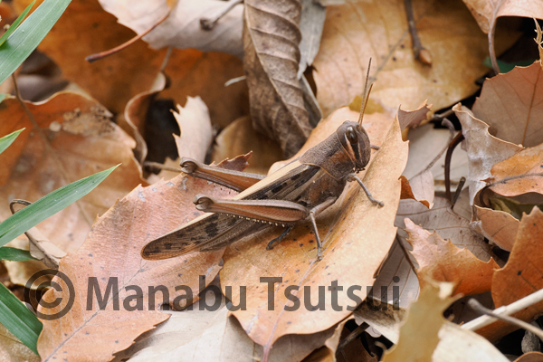 枯葉の積もりだした林床を歩くと、ツチイナゴが飛び出します。