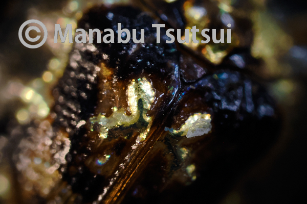 ガラス面に止まらせて、室内照明の定常光と、LEDスポットライトで光のメリハリをつけながら撮影しました。