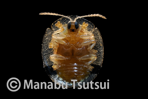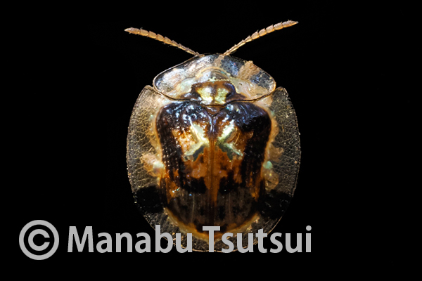 種名「ジンガサハムシ」を代表として各種いますが、背中の隆起が高く立体的で、もっとも陣笠に形状が近いのがセモンジンガサハムシのような気がします。
