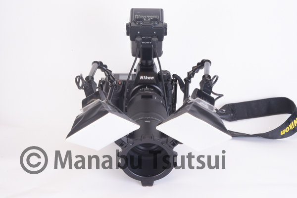 このシステムは、虫の目レンズ使用時も、専用取り付け部を自作して使用していますが、マクロ撮影全般でのライティングの自由度を保ちつつ、各種レンズに対応できる点で、もっとも使いやすいと感じています。