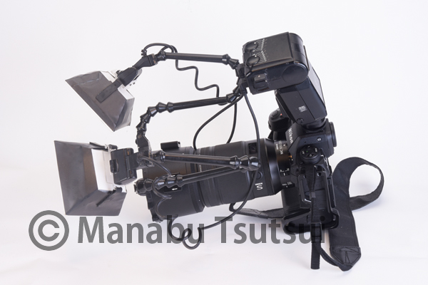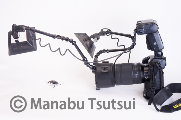 昆虫の撮影では、100mm前後(35mm換算)の中望遠レンズが一般的に理想とする中で、ワーキングディスタンスは100~300mmほどの領域が中心です。光線条件はシーンによって様々ですが、すばやくトップライトか逆光気味の光線を意図的に入れたいと感じた時、発光部を大きく繰り出せるようなアームがあればと常に感じていました。小型ストロボを携帯してセッティングの上、同調させるという手法も一般的ですが、ツインストロボのいずれか1灯が活用できれば即対応ができ一番理想的です。