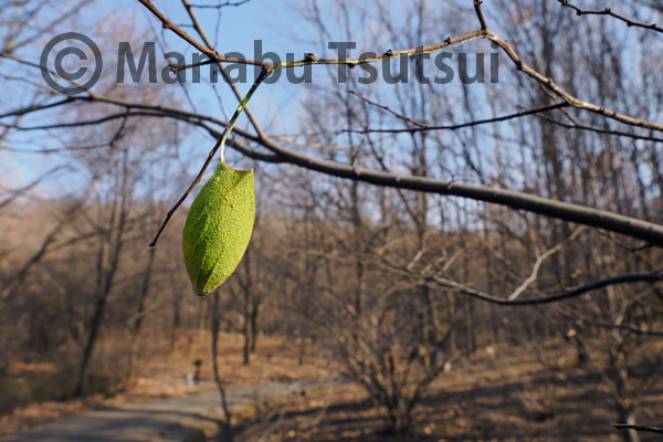 園路に沿って歩いていると、エノキの梢にウスタビガの空繭が見つかります。