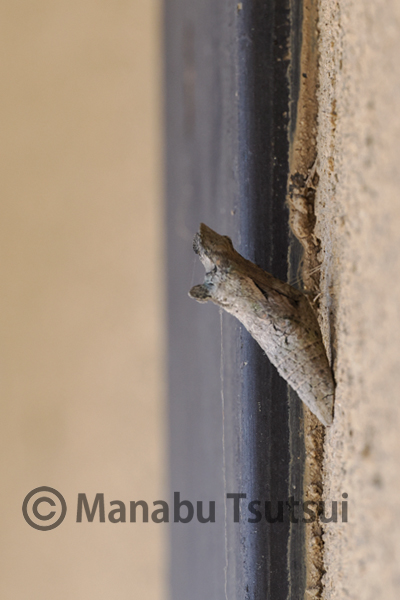民家に立ち寄り、壁に付いたアゲハの越冬蛹を確認します。