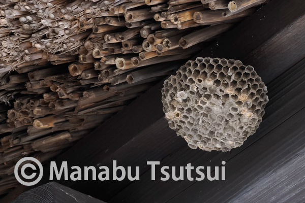 はるかに見上げた、かやぶき屋根の軒下に、セグロアシナガバチの古い巣がありました。