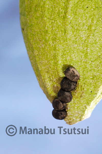 その後は、枝先や幹に点々と産卵していくわけですが、ヤママユガに比べると、見つけづらい卵です。