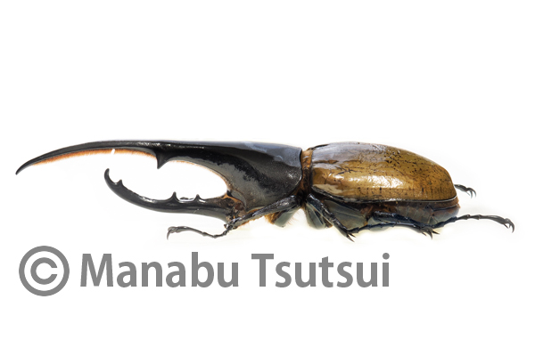 背面では、長く伸びた胸角の右側縦方向にテカリが入るように撮影してみました。