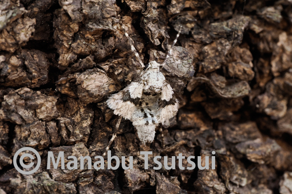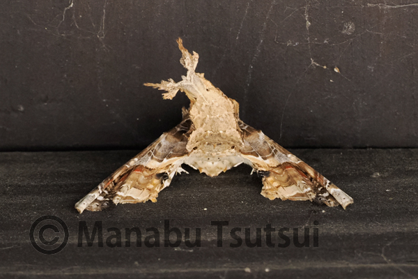 この蛾の静止ポーズはとても個性的で、写真は真後ろから見た姿です。