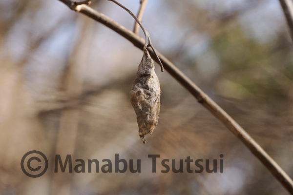 ほぼ一周し、そろそろという時間帯、この冬に何度も行き来していた道脇で、シンジュサンの繭が見つかりました。