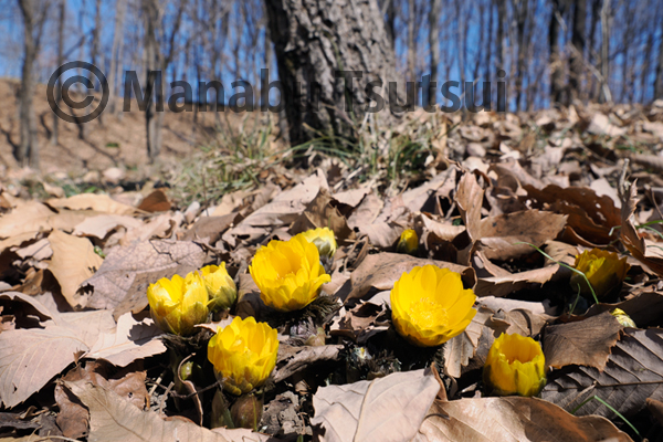 水田の東側の斜面では、フクジュソウの開花が始まっていました。