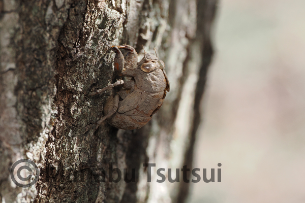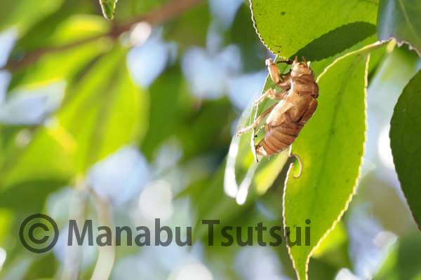ツバキを覗き込むと、アブラゼミの抜け殻が付いていました。