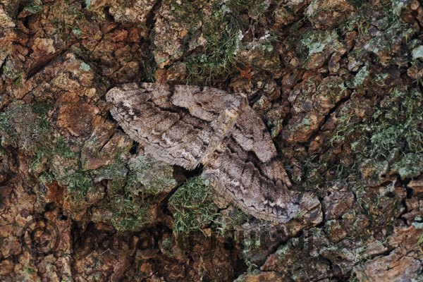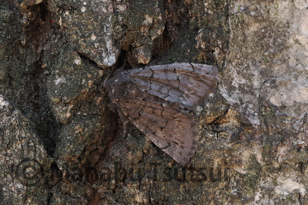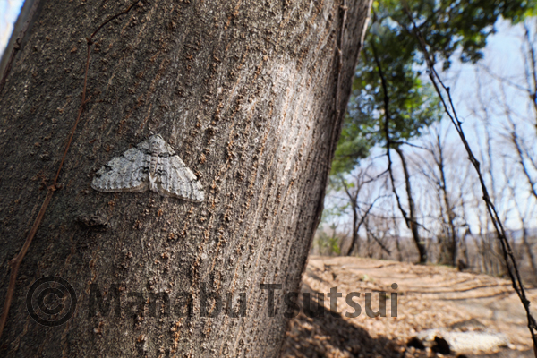 歩き始めてすぐに、シラカシの幹に止まるシロトゲエダシャクが目に入ります。