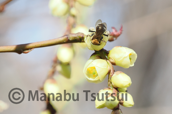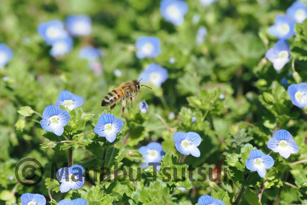 堤池のほとりにはオオイヌノフグリの大群落があり、セイヨウミツバチが集まっています。