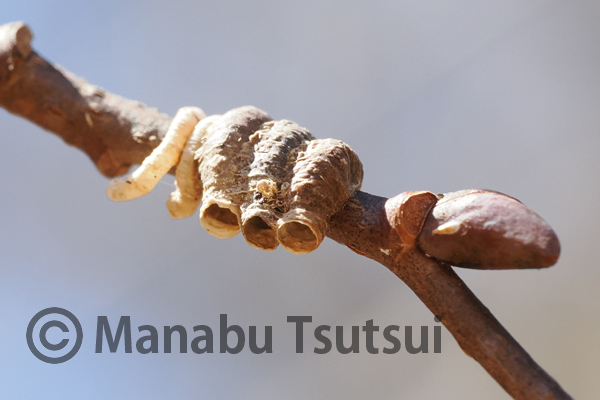 冬芽と樹皮で判断ができませんでしたが、シナノキかオオバボダイジュがあり、枝先を見るとタケウチトゲアワフキの幼虫の巣が見つかりました。