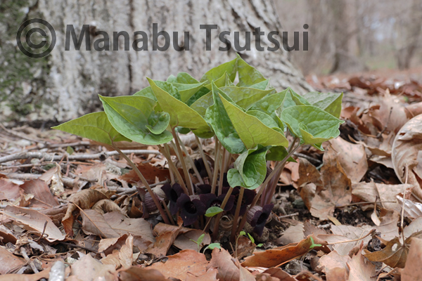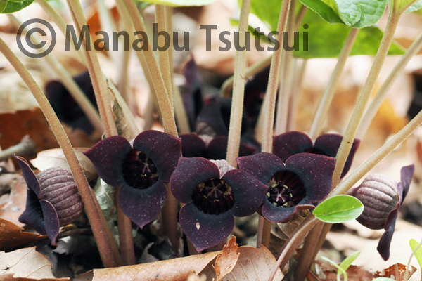 林床ではウスバサイシンが葉を伸ばし、地際で特徴的な花を咲かせています。