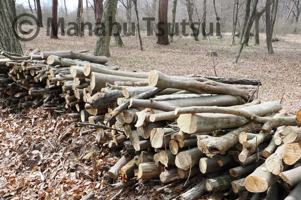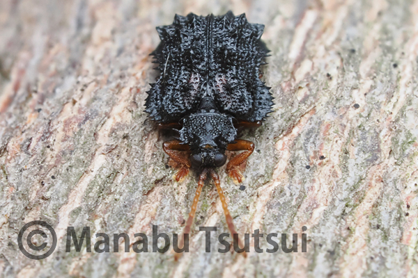 林内の貯木を覗き込むと、ベニヒラタムシが数匹、活発に歩き回っては飛翔していました。