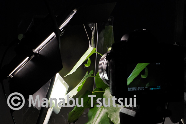 定位している葉に透過する照明を入れて、前蛹にも逆光を入れつつ、フロントからもやや弱い光を当てます。