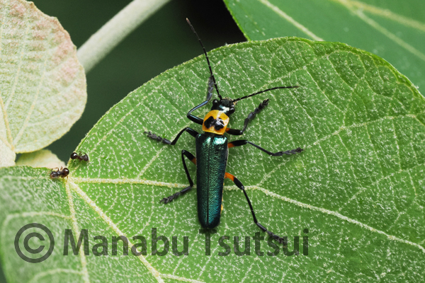 アカメガシワの葉上に、アマミアオジョウカイが見つかります。