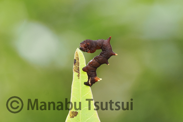 歩き始めて早々に横田さんがハゼノキでクロモンカギバ幼虫を見つけ出します。