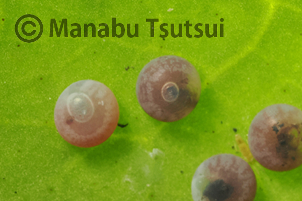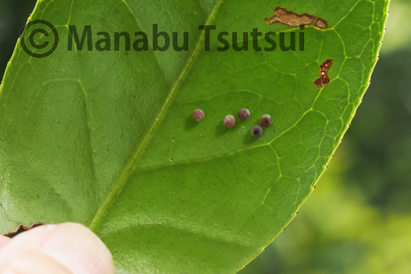 その先、ヤブツバキの葉裏で、横田さんが卵を発見します。