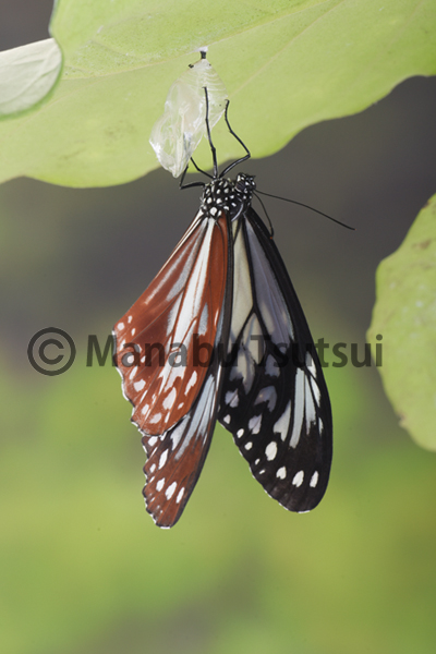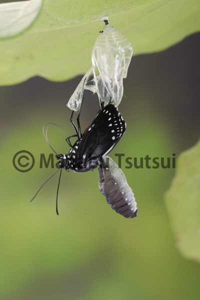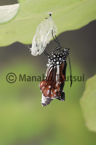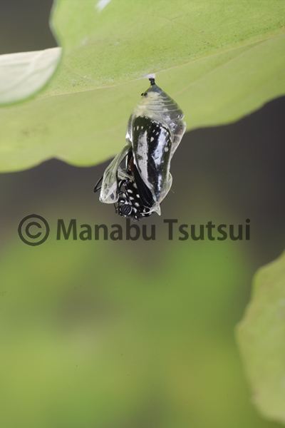 マダラチョウのなかまは、蛹の皮膚が透明で、かなりはっきりと成虫の体が透けて確認できますが、空気層のような兆候は確認できず、しかも体節が伸びるという現象もわかりづらく、経験値がない撮影です。